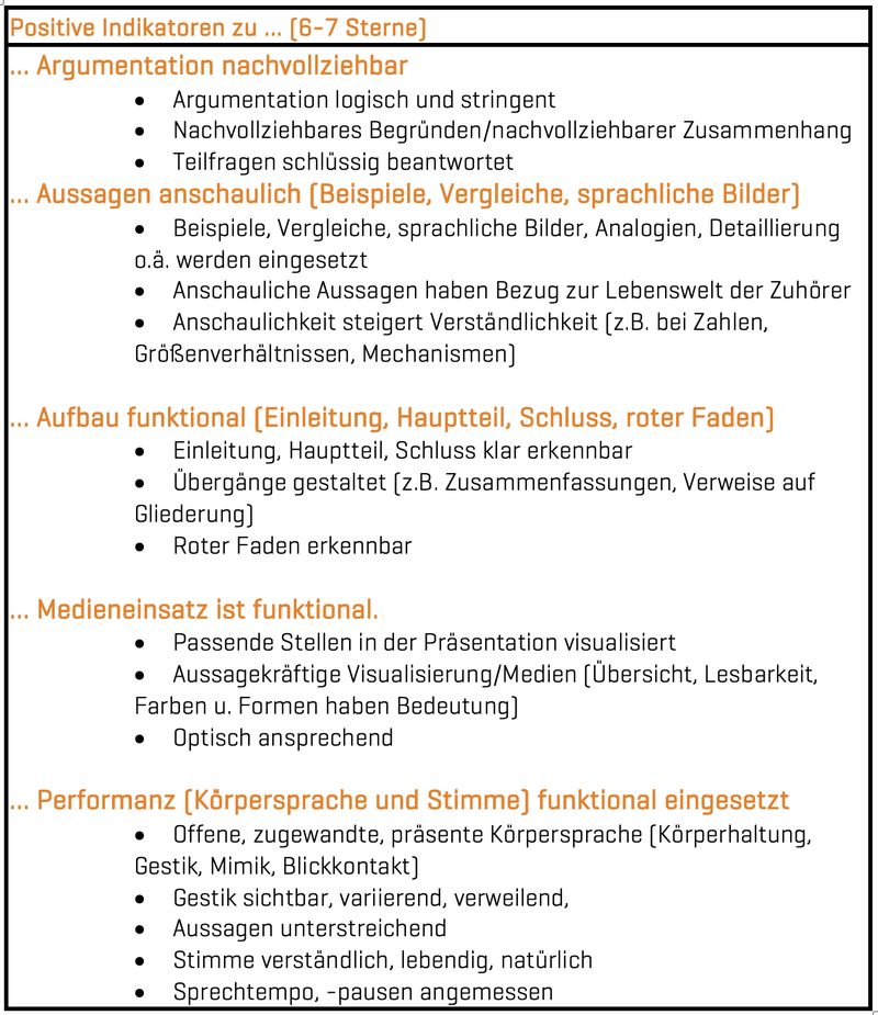 Im Folgenden finden Sie zu jedem Kriterium konkrete, verhaltensnahe und exemplarische Hinweise (Indikatoren) für ein gelungenes Präsentationsverhalten.