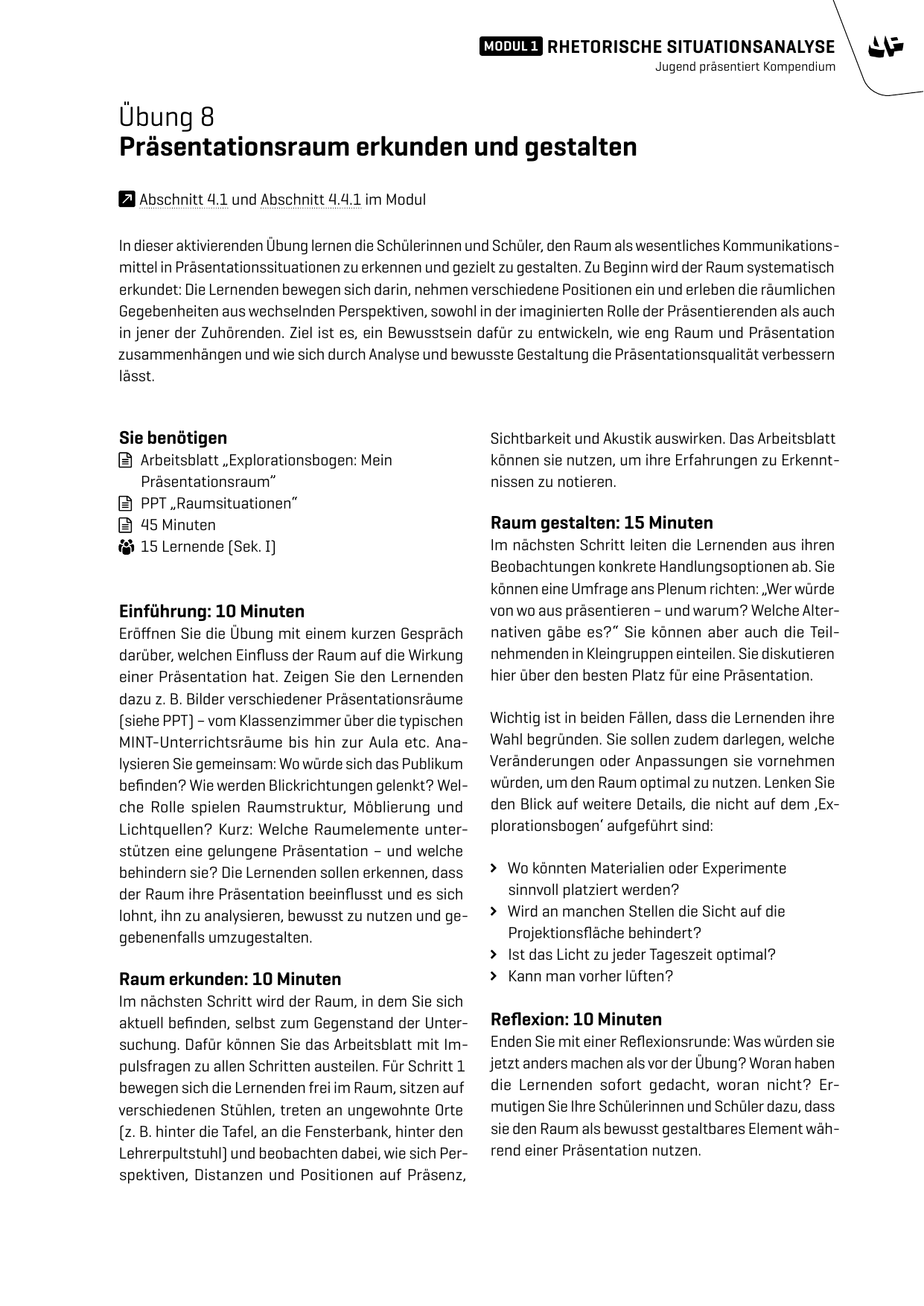 Lernende erkunden den Raum aus Sprechenden- und Publikumssicht und leiten Gestaltungsoptionen ab.