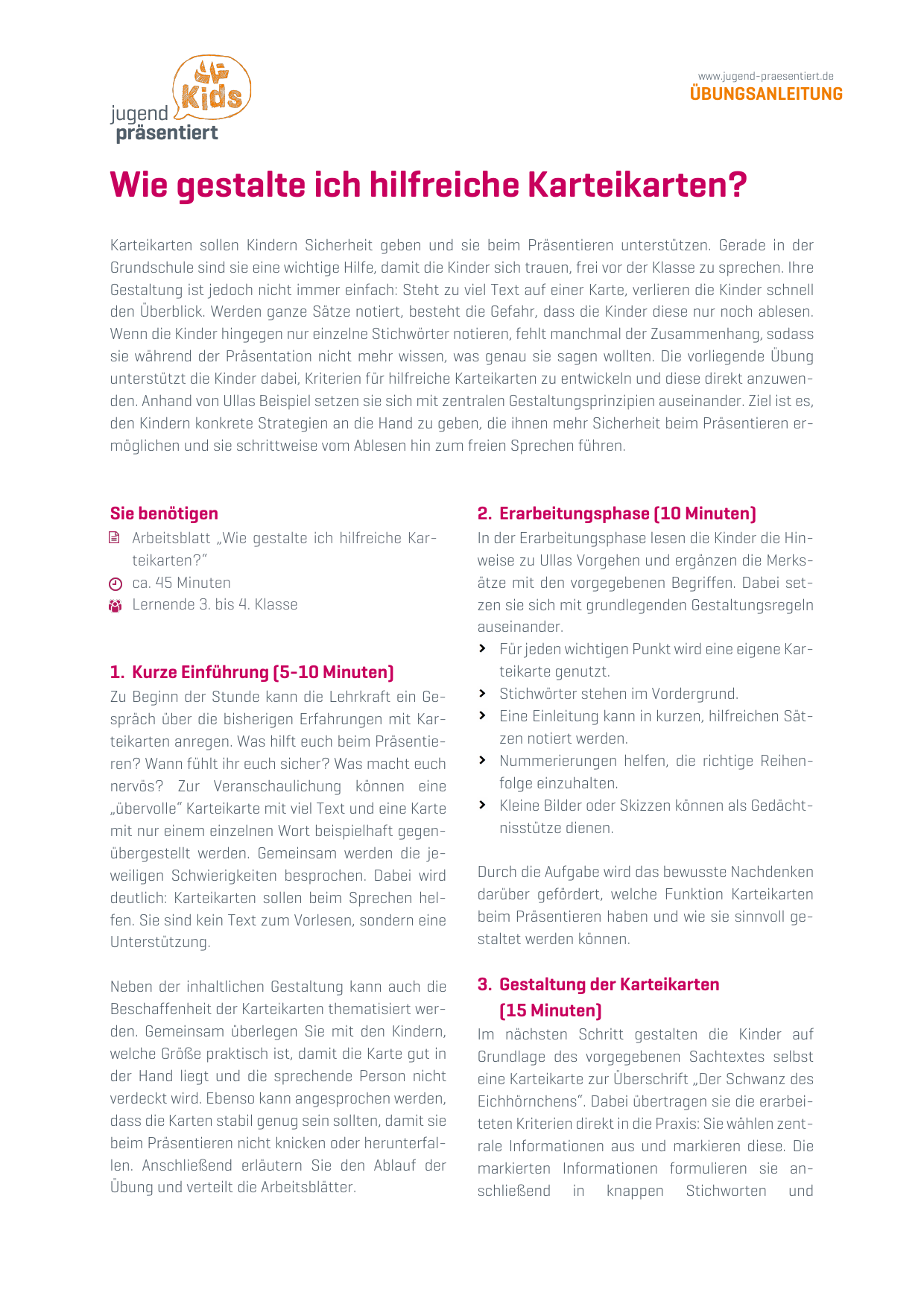 Kinder lernen hilfreiche Karteikarten zu gestalten, die sie beim freien Sprechen unterstützen.