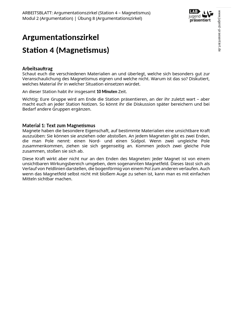 Arbeitsblatt – Argumentationszirkel (Station 4 – Magnetismus)