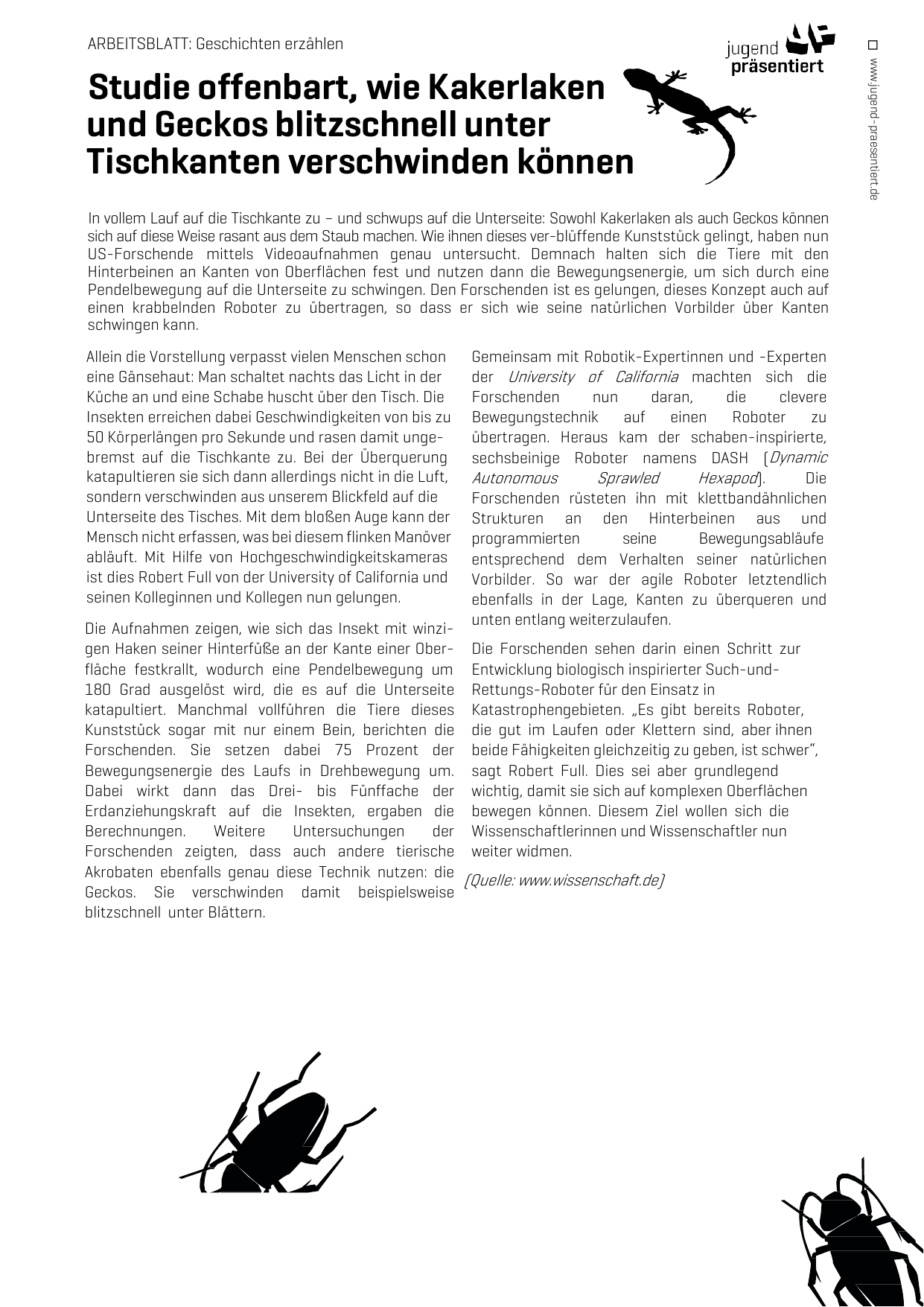 Arbeitsblatt - Text Geckos und Kakerlaken