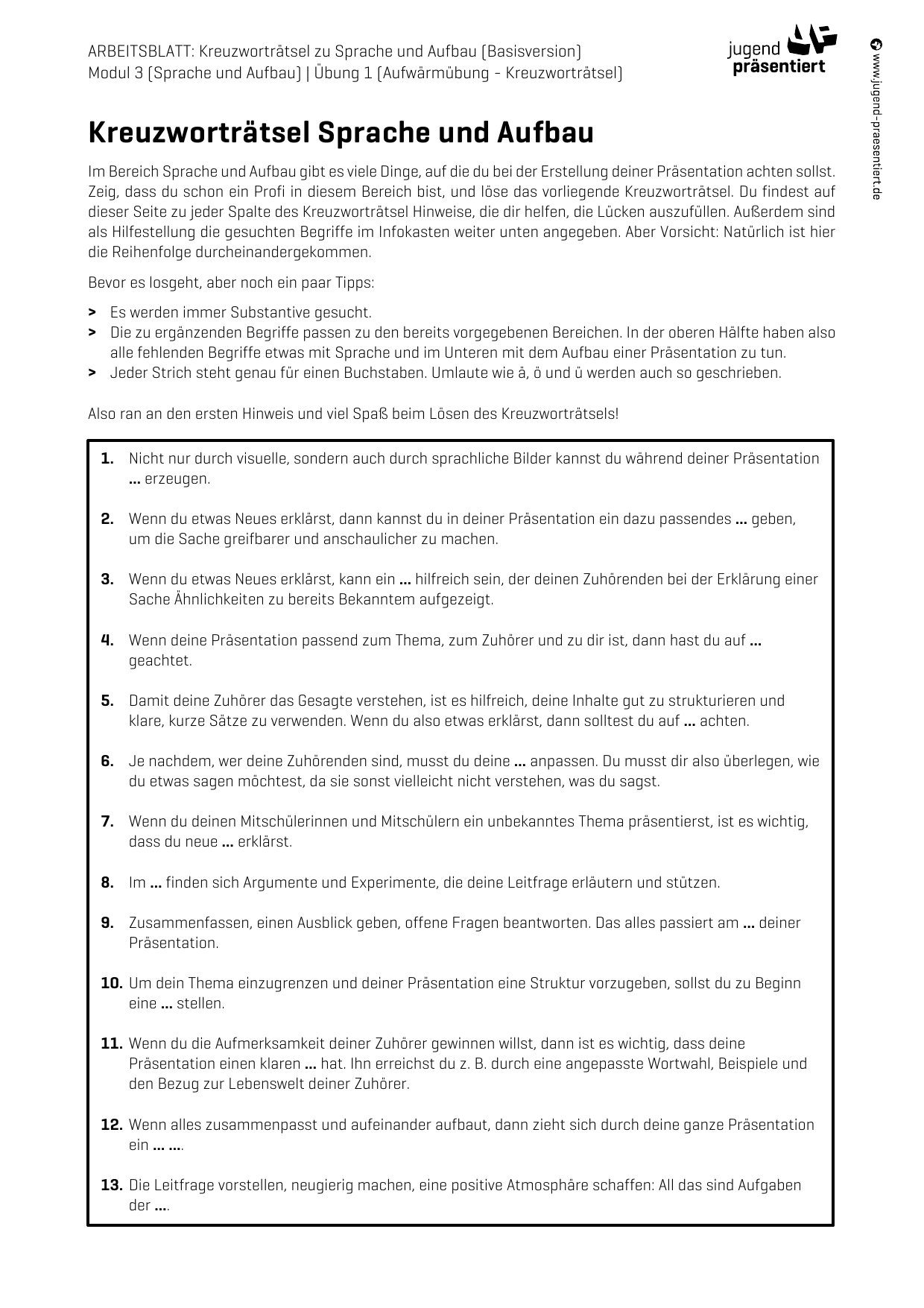 Arbeitsblatt – Kreuzworträtsel zu Sprache und Aufbau (Basisversion)
