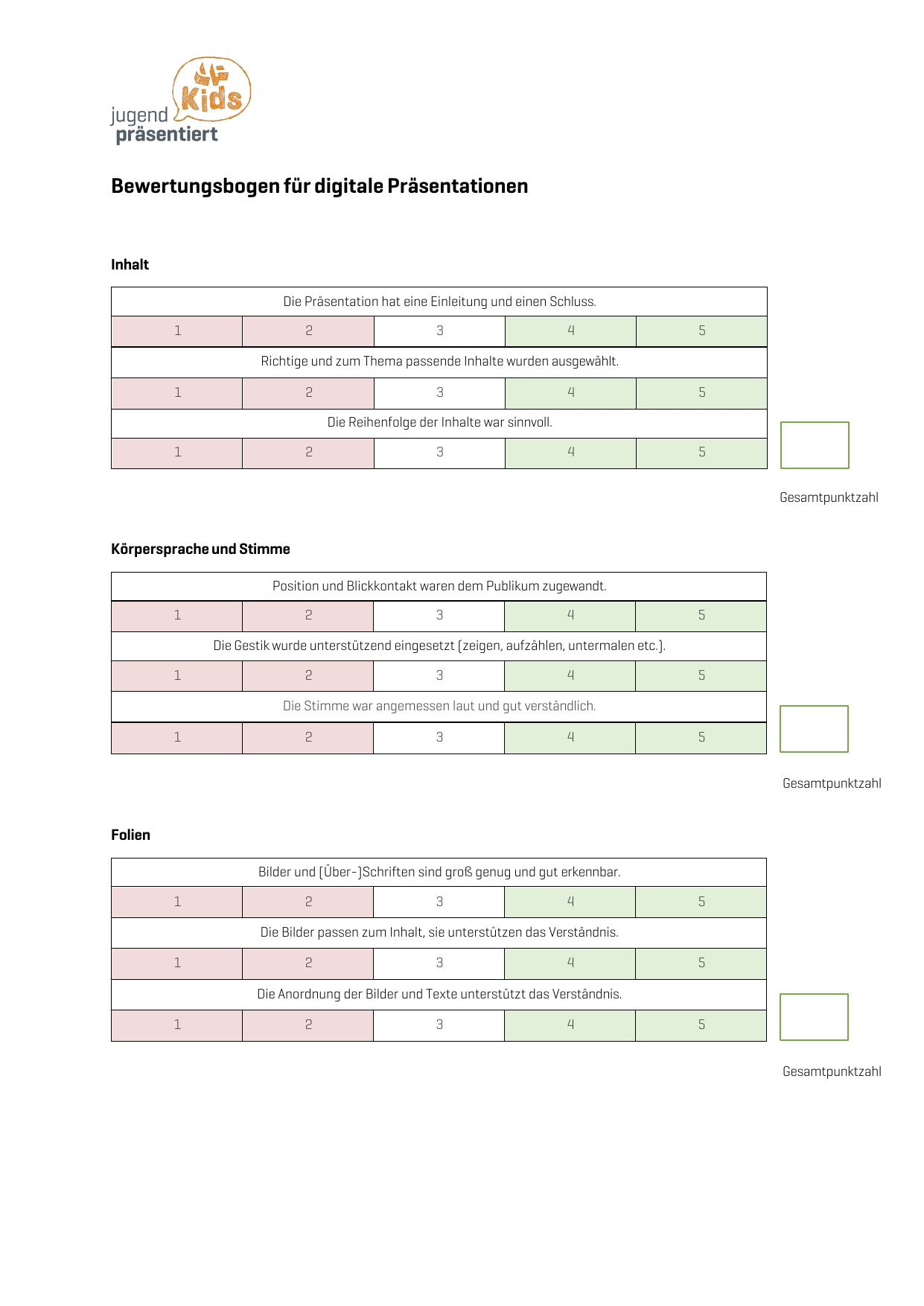 Hier finden Sie Bewertungsbögen für Lehrkräfte und Rückmeldebögen für Schüler*innen
