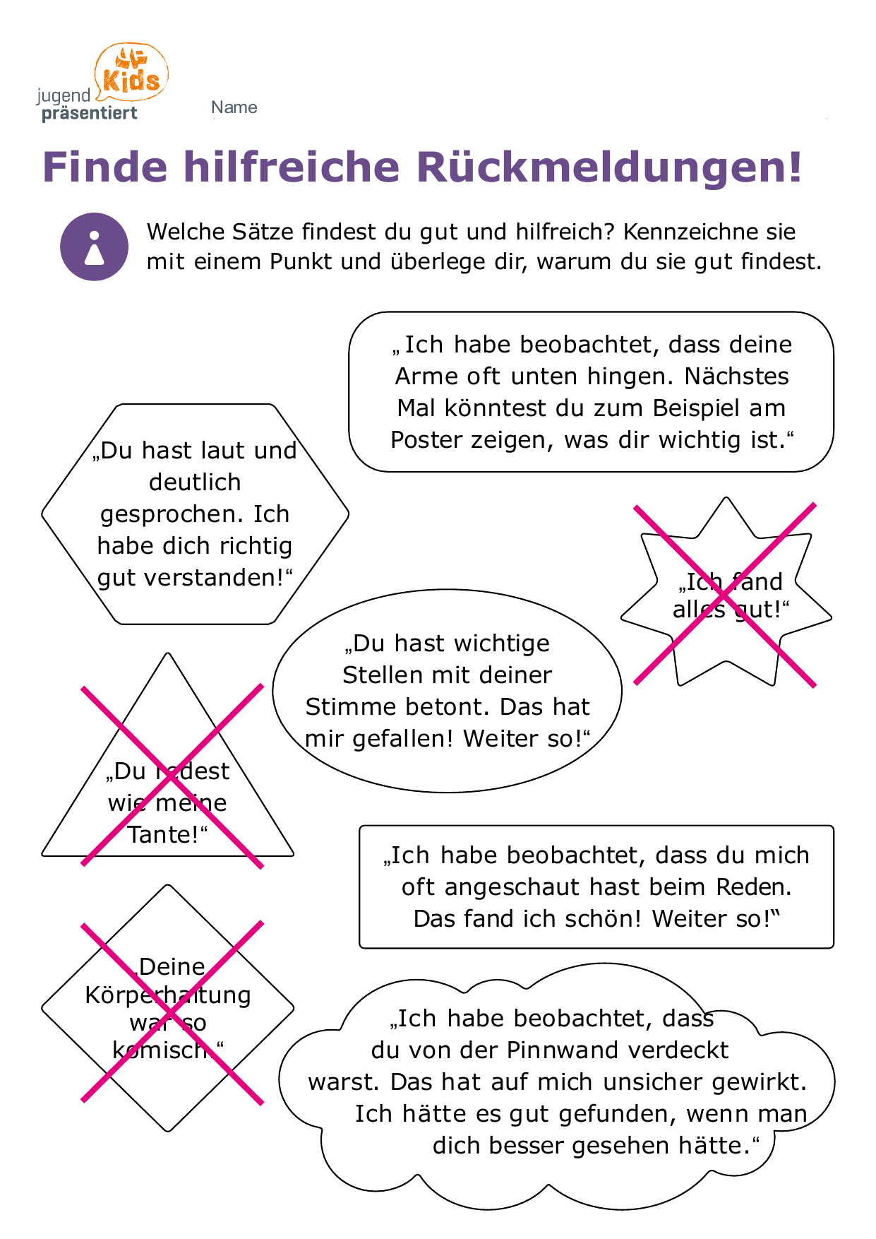 Die Kinder üben anhand vorgegebener Sätze, hilfreiche und konstruktive Rückmeldungen zu erkennen.