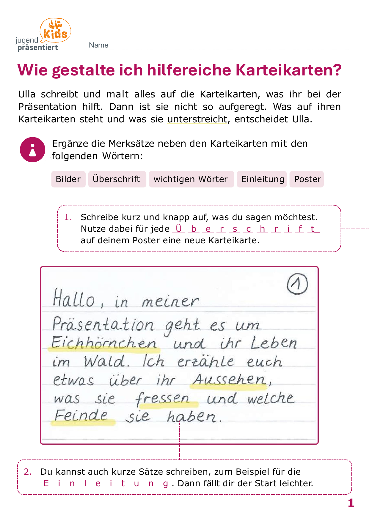 Kinder lernen hilfreiche Karteikarten zu gestalten, die sie beim freien Sprechen unterstützen.