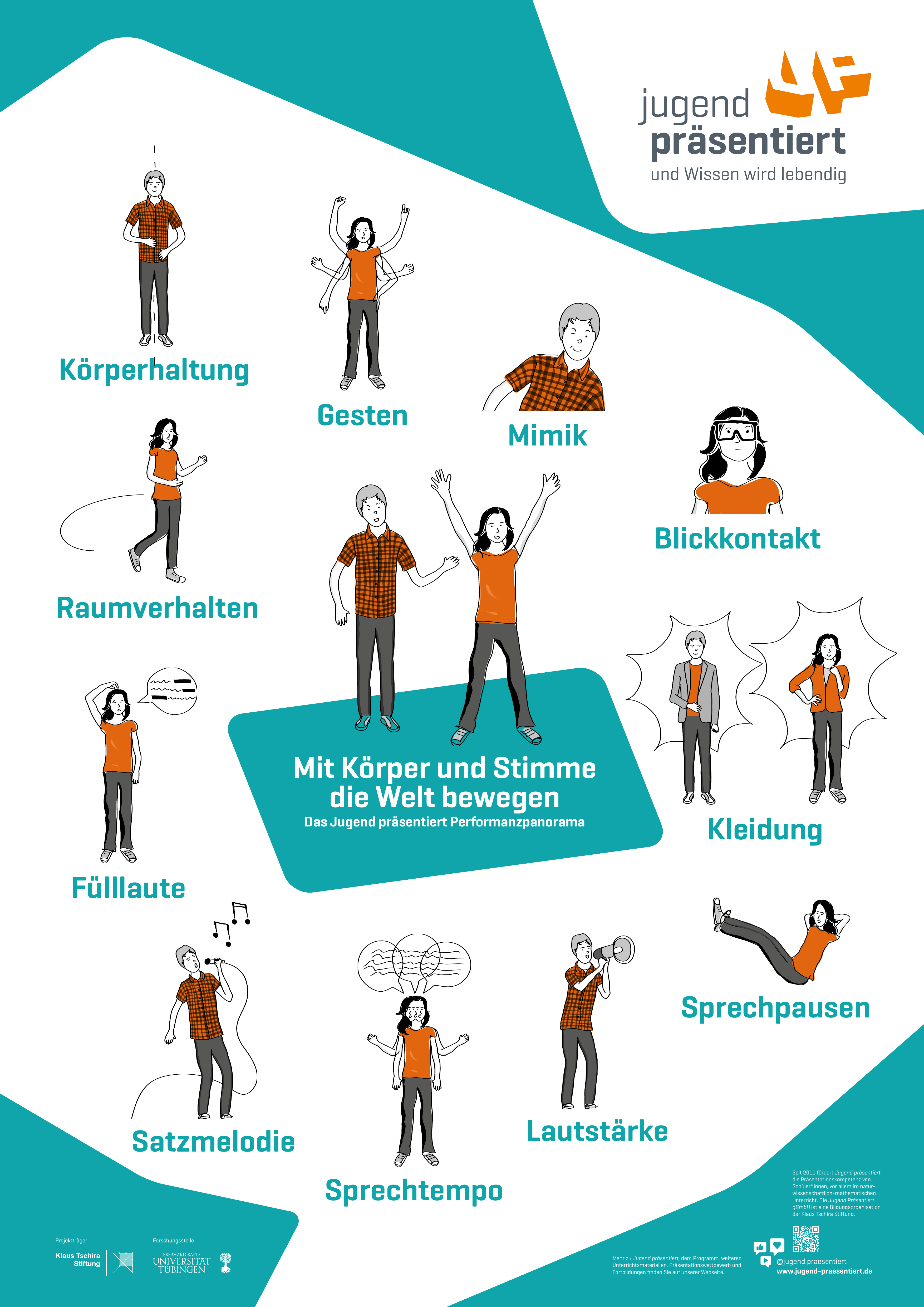 Dieses Plakat zeigt auf welche Bestandteile in Körpersprache und Stimme (Körperhaltung, Gesten, Mimik, Blickkontakt, Kleidung, Raumverhalten, Lautstärke, Sprechtempo, Satzmelodie, Sprechpausen, Fülllaute) Schüler*innen bei ihrer Präsentation beachten sollten.