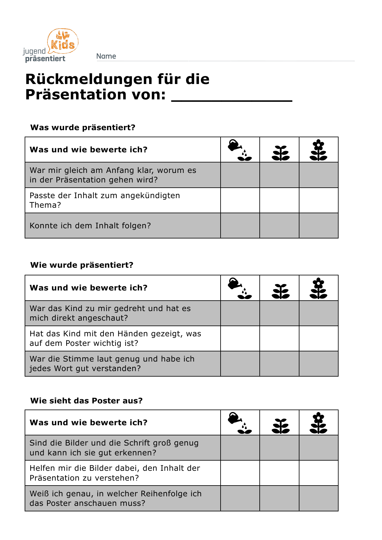 Hier finden Sie Bewertungsbögen für Lehrkräfte und Rückmeldebögen für Schüler*innen