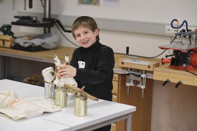 Los geht es mit der Bastelphase. Die Kinder bekommen dafür ein Bord mit sechs Fragen darauf. Die Kinder sollen sich zunächst mit einem Problem auseinandersetzen und überlegen, wie sie es durch eine eigene Erfindung lösen können. Anschließend sollen sie die Funktionsweise und den Bauprozess ihrer Erfindung planen, sie benennen und argumentieren, warum sie besonders gut ist. Außerdem sollen sie überlegen, wie sie ihre Idee noch verbessern könnten. Was dabei an Kreationen herauskommt, erinnert an einen Bionik-Probierkurs. Erst ist die Erfindung nur eine Skizze, dann ist sie schnell Wirklichkeit. Paul zum Beispiel sorgt sich im Wald vor eventuell aufkommender Langeweile und einem Mangel an bequemen Sitzgelegenheiten. Außerdem findet er, dass ein Wasserfilter im Wald sinnvoll wäre. Seine Erfindung löst alle drei Probleme. Das Jugend präsentiert-Stifteset wird zur bequemen Bank und zum Wasserfilter auf dem Moosgrund des Waldes.