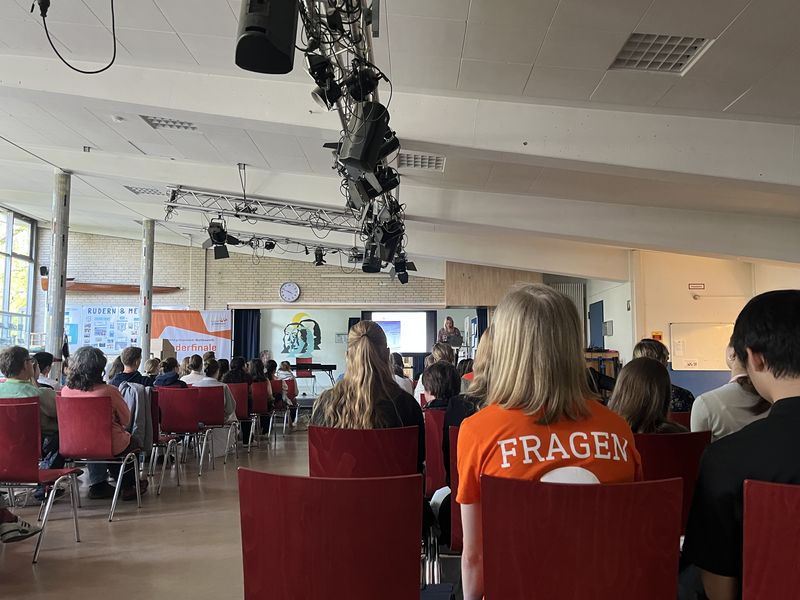 Inhaltlich bekamen Ella und Eva einiges geboten: „Unsere zu bewertenden Präsentationen waren in den Bereichen Biologie, Geografie und Physik angesiedelt. Auch wir haben inhaltlich viel aus den Präsentationen gelernt, wie zum Beispiel: Wie man Cola in der Sonne abkühlen kann oder wie genau Neuronale Netze (KI) funktionieren.“ Auch technische Pannen gehörten dazu – diese konnten aber meist mit Unterstützung der Helfer*innen der Schule schnell behoben werden. Nach jeder Präsentation wurde unabhängig bewertet, anschließend gemeinsam diskutiert und direkt im Anschluss Feedback gegeben. Ella und Eva berichten: „Nach einer kurzen Besprechung im Jury-Team haben wir den Präsentierenden das Feedback gegeben, welches sie sich mitschreiben konnten, um weiter an ihren Präsentations-Skills zu arbeiten.“
